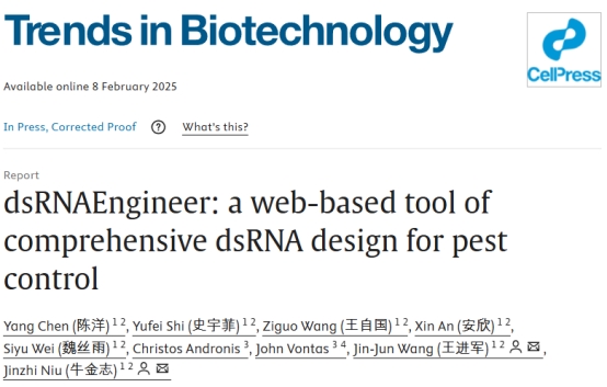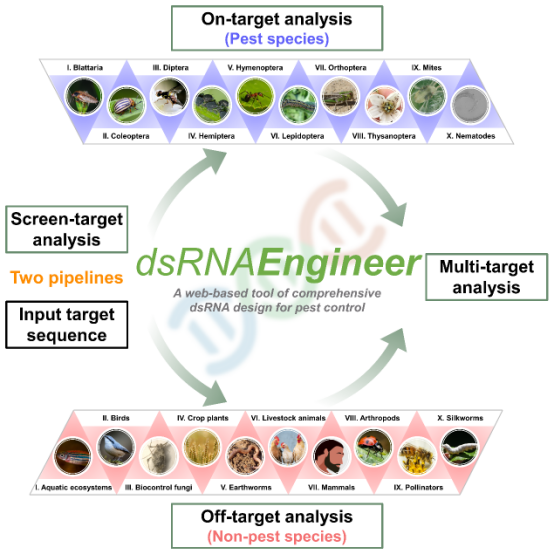近日,学院王进军教授团队在Cell Press旗下子刊《Trends in Biotechnology》发表了题为“dsRNAEngineer: a web-based tool of comprehensive dsRNA design for pest control”的研究论文。该研究开发了一款名为“dsRNAEngineer”的在线工具(https://dsrna-engineer.cn/),该工具具备Screen-target(筛靶分析)、On-target(靶向分析)、Off-target(脱靶分析)和Multi-target(多靶点分析)四大功能,为RNA生物农药的开发提供了高效、安全的解决方案。随着RNA生物农药的兴起,该工具有望为RNAi生物技术在有害生物防治领域的应用提供有力支持,助力可持续农业的发展。