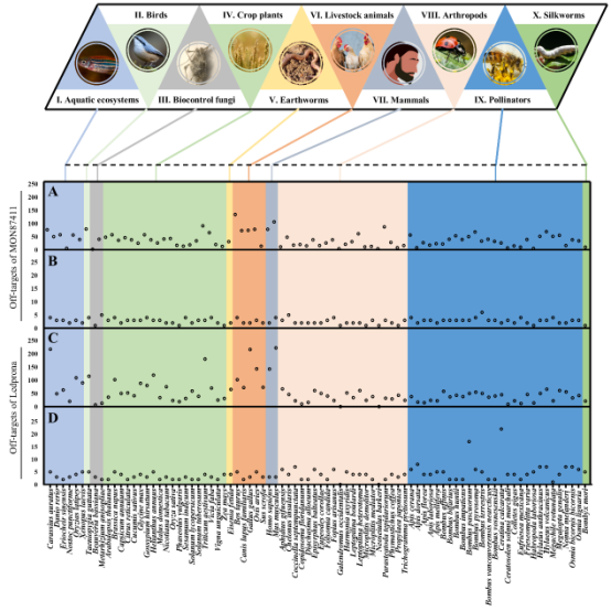 同时,利用dsRNAEngineer 对2种登记的RNAi控虫靶标(MON87411和Ledprona)开展评估。分析选取84种非靶标生物(包括水生生物、鸟类、传粉昆虫、益虫、家畜等),从转录组水平和单基因最大脱靶风险两个维度分析: