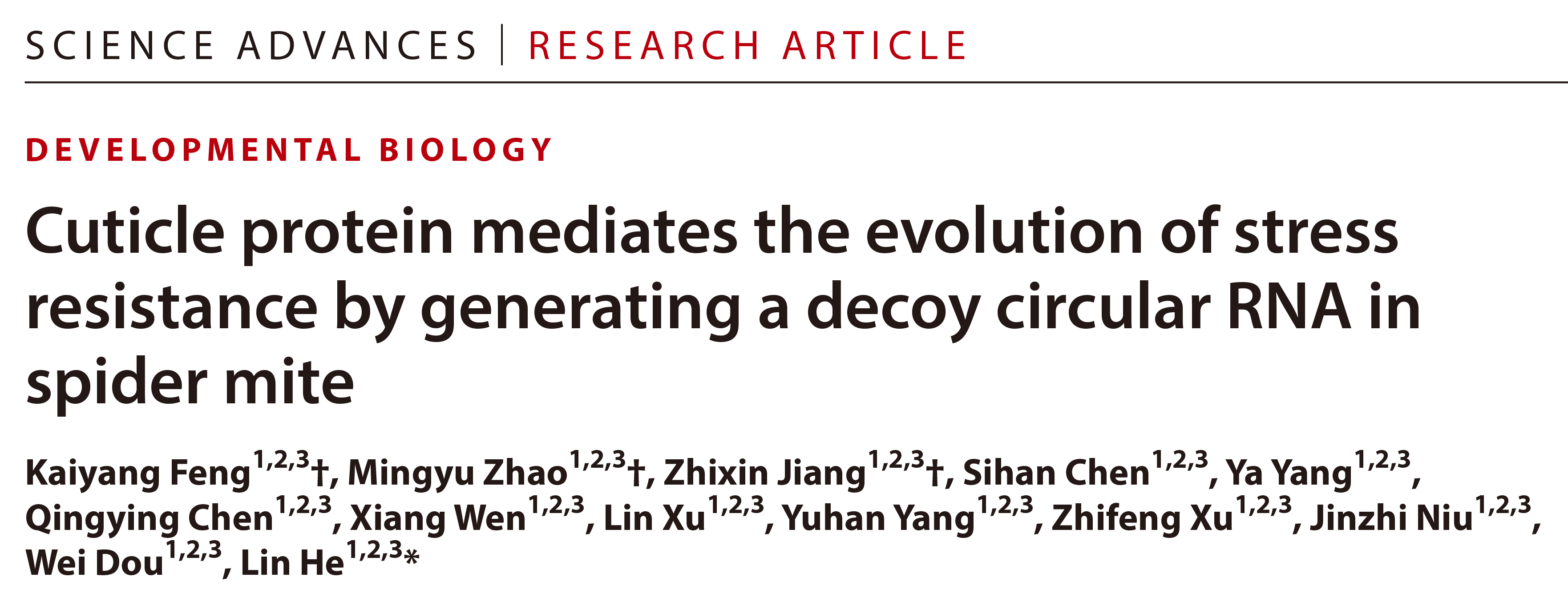 近日,学院何林教授团队在Science子刊《Science Advances》上在线发表了题为“Cuticle protein mediates the evolution of stress resistance by generating a decoy circular RNA in spider mite”的研究论文,首次发现并系统阐明了朱砂叶螨表皮发育增厚会导致其对多种杀螨剂产生广谱的交互抗性,表皮蛋白可通过释放“诱饵”RNA拮抗并抑制miRNA簇的功能,从而调控自身过表达,最终导致朱砂叶螨表皮发育增厚,促进其抗逆性进化的分子新机制。