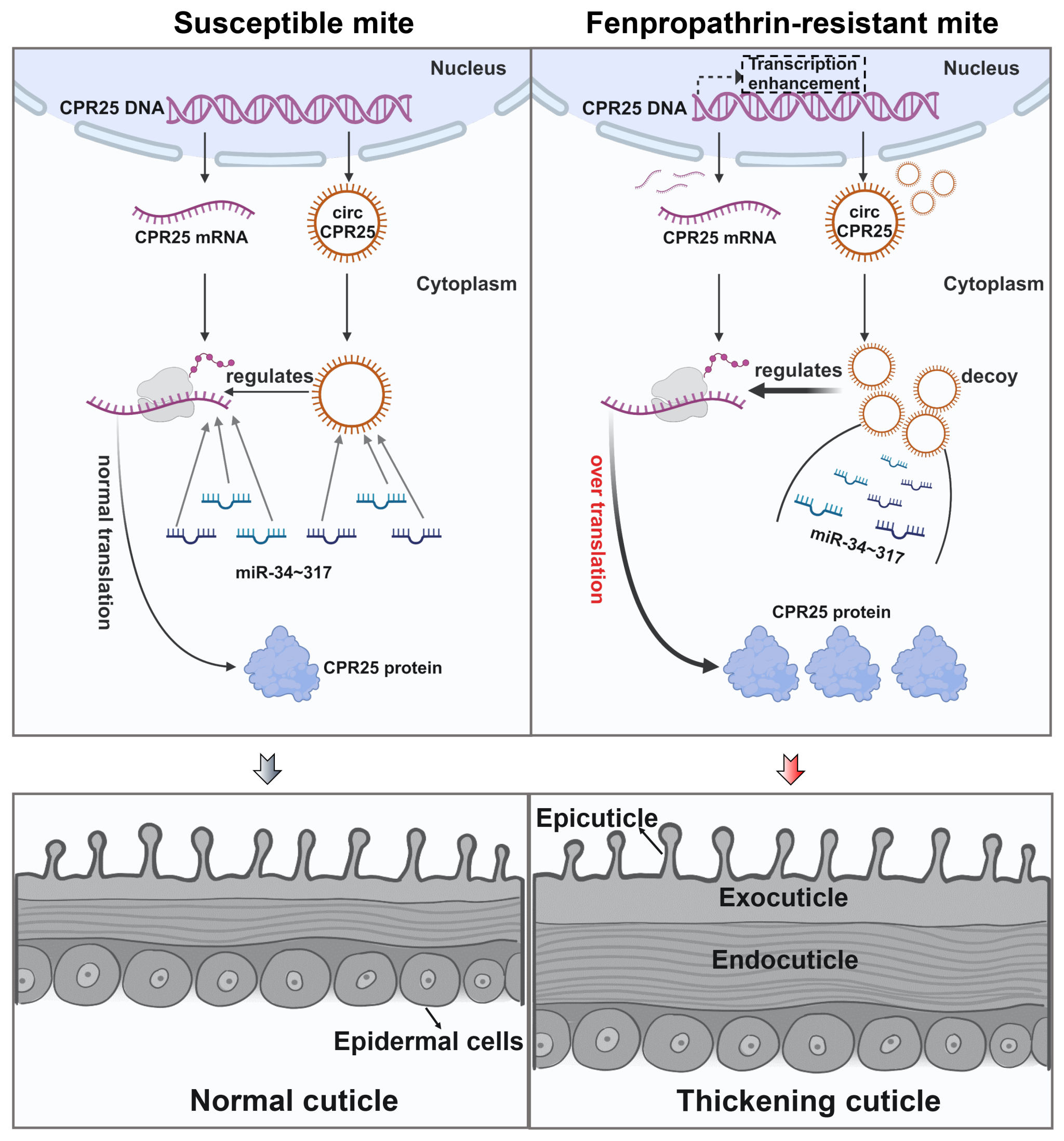 研究团队以朱砂叶螨甲氰菊酯高抗品系为研究对象,首先明确了抗性个体表皮增厚、杀螨剂触杀活性降低,导致防控难度加大的事实;其次发现表皮增厚还显著提升了朱砂叶螨对高温干旱环境的适应能力。进一步研究发现表皮蛋白CPR25大幅度过表达是介导抗性朱砂叶螨表皮增厚的关键因素,而CPR25的表达受到miR-34~317簇的反向调控。随后的研究证明CPR25的过表达来源于一种独特的机制,即其DNA在转录成mRNA的同时伴随产生了环状“子”RNA,circCPR25;circCPR25扮演了“诱饵”角色,可高效结合miR-34~317簇并抑制其功能,显著减少miR-34~317簇与CPR25的结合,进而调控CPR25的过表达,翻译产生更多的表皮蛋白,最终导致朱砂叶螨表皮发育增厚与抗逆性进化(图1)。这种主动产生并释放“子”RNA,吸引结合miRNA簇,从而完成自身过表达的调控机制与战斗机应对导弹来袭时主动释放干扰弹有异曲同工之妙。研究结果为理解节肢动物抗药性进化中伴随的表皮发育改变机制提供了新见解,也为拟除虫菊酯类药剂的抗性治理以及叶螨防控新靶标的挖掘奠定了理论基础。