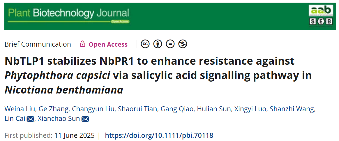 2025年6月11日,学院孙现超教授团队在《Plant Biotechnology Journal》发表题为“NbTLP1 stabilizes NbPR1 to enhance resistance against Phytophthora capsici via salicylic acid signalling pathway in Nicotiana benthamiana”的研究论文。该研究系统揭示了PR-5家族蛋白NbTLP1在烟草中通过稳定NbPR1蛋白,增强植物对辣椒疫霉的免疫机制,并证实该过程依赖于水杨酸信号通路。这一发现为解析卵菌病害的植物免疫响应提供了新思路,也为抗病育种提供了理论基础。