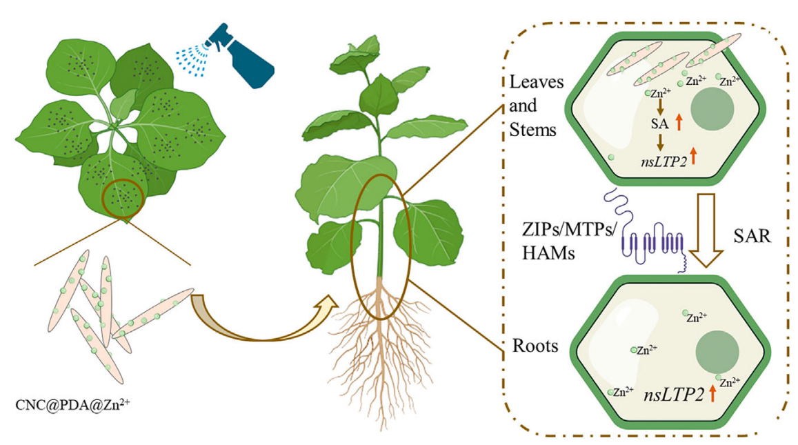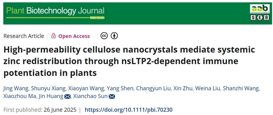 2025年6月26日,学院孙现超教授团队在国际植物科学顶级期刊《Plant Biotechnology Journal》发表了题为 “High‐permeability cellulose nanocrystals mediate systemic zinc redistribution through nsLTP2‐dependent immune potentiation in plants”的研究论文。该研究创新性地开发了一种高渗透性纳米锌材料(CNC@PDA@Zn²⁺),不仅是目前已知可在植物体内发挥抗病毒作用的最低锌浓度递送体系,还揭示其可通过诱导非特异性脂质转运蛋白nsLTP2表达与定位变化,激活水杨酸(SA)信号通路,从而在植物体内实现系统性锌再分配与抗病毒免疫的双重调控。