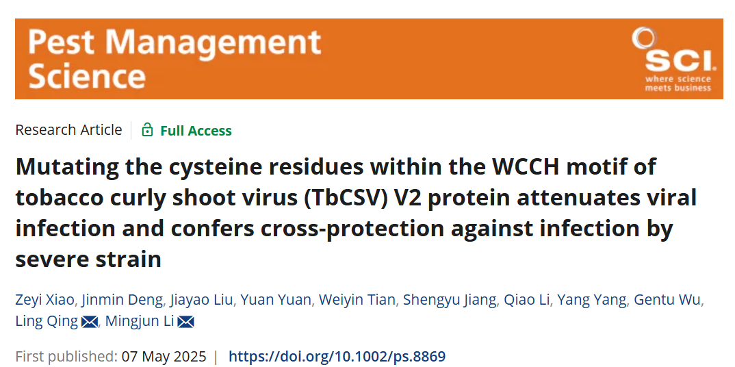专业实习是理论与实践相结合的关键环节,它能让学生在实践场景中将所学知识运用到具体任务中,提升动手能力和解决问题的水平。我院高度重视本科生实习实践环节,近年来在学生学科竞赛、创新能力培养方面成效显著。近日,我院植物病毒生物学与绿色防控研究团队李明骏副教授指导本科实习生肖泽祎在Pest Management Science期刊发表题为“Mutating the cysteine residues within the WCCH motif of tobacco curly shoot virus (TbCSV) V2 protein attenuates viral infection and confers cross-protection against infection by severe strain”的研究论文。该研究聚焦双生病毒重要功能蛋白V2中高度保守的“WCCH”基序,揭示了基序中半胱氨酸残基的生物学重要性;基于此构建了半胱氨酸突变的TbCSV弱毒株,明确了其在植物寄主中抵御野生型TbCSV侵染的交叉保护效果。研究结果为TbCSV V2蛋白的致病机制提供了新见解,也为利用交叉保护策略进行TbCSV的田间防治奠定了良好基础。
