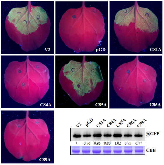 图1. TbCSV V2蛋白C84、C86或C89突变消除其沉默抑制子活性