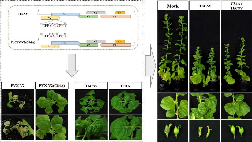 为评估致病性减弱的TbCSV突变体的交叉保护潜力,在本氏烟和番茄植株中预先接种TbCSV弱毒突变体C84A,然后挑战接种野生型TbCSV,发现弱毒株TbCSV-V2(C84A)预接种会显著减弱野生型TbCSV侵染的症状严重度和病毒积累水平,显示出明显的交叉保护能力(图3)。