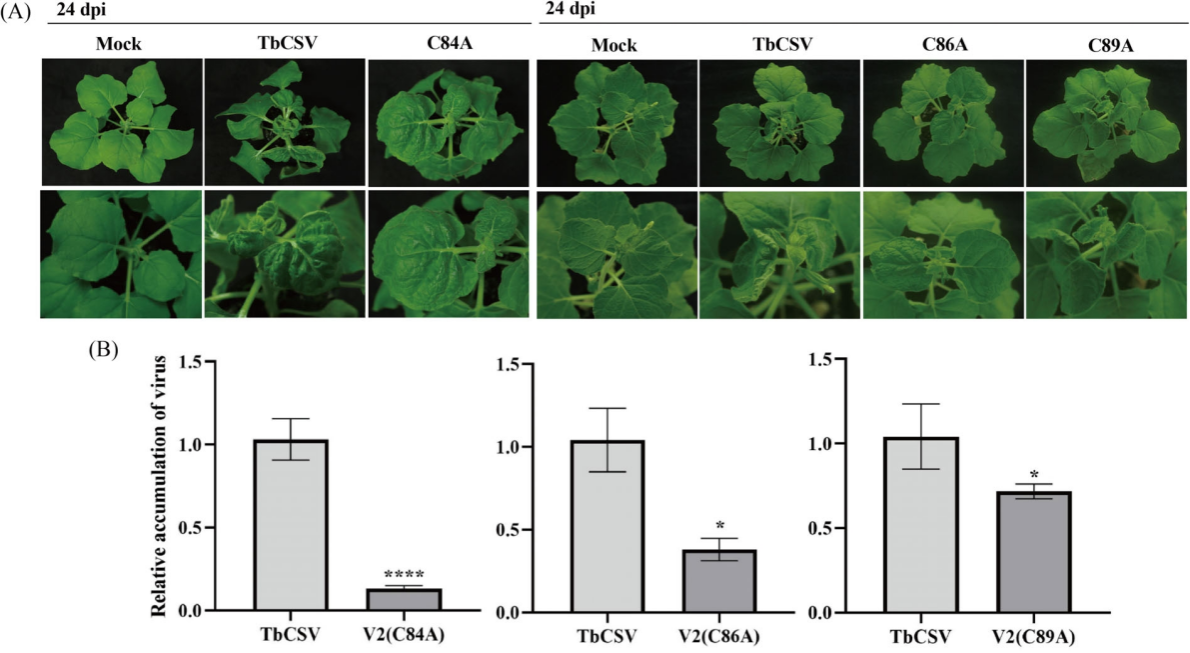 图2. V2蛋白C84、C86或C89位点突变导致TbCSV突变体致病力下降