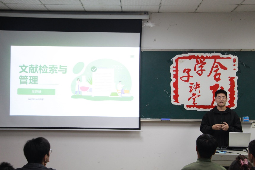 接着吴双雄以“文献检索与管理”为主题,从期刊介绍、文献阅读、文献检索和文献管理四个方面分享如何研读文献和检索管理文献。吴双雄首先介绍了中国科学院文献情报中心期刊分区表与昆虫学领域一区期刊,从阅读顺序、文献精读两方面介绍文献高效阅读策略。最后吴双雄向同学们分享了中英文文献检索方法,通过现场演示介绍文献管理工具Endnote的使用方法,帮助同学更好地进行文献阅读和文献管理。