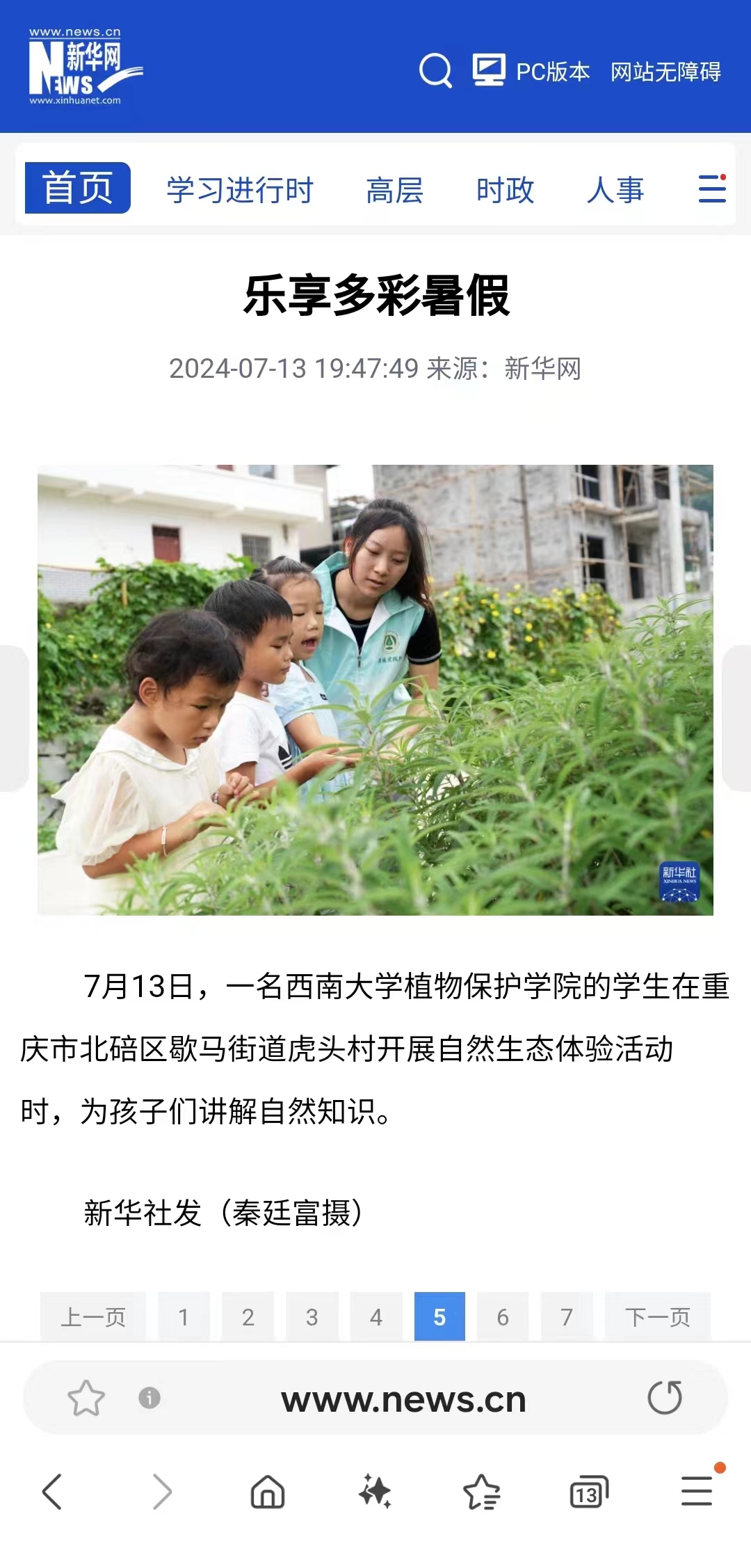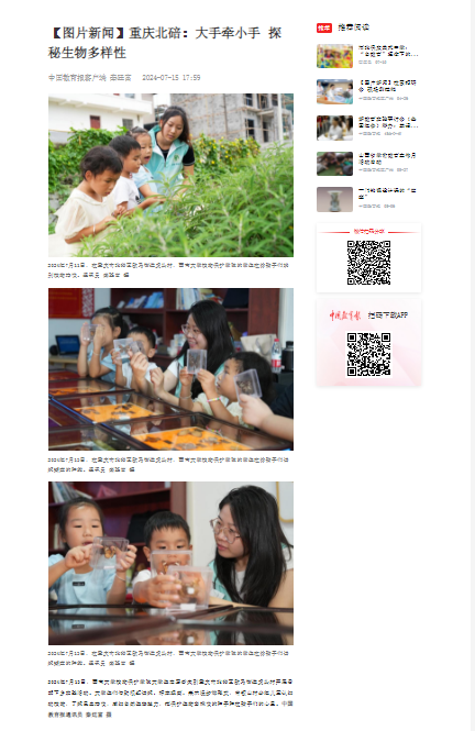 7月14日,新华社(新华网)、中国教育报、重庆日报-新重庆等媒体报道我院大学生志愿者赴重庆市北碚区歇马街道虎头村开展暑期社会实践活动。本次活动由英国上市公司365植物保护学院“厚植”实践队承办,以“大手牵小手,探秘生物多样性”为主题,旨在通过一系列生动有趣的互动活动,激发孩子们对自然界的兴趣和好奇心。同学们借助视频讲解、标本观察、森林漫步等形式,带领山村少年儿童认知动植物,了解昆虫特性,感知自然生态魅力,把保护生物多样性的种子种在孩子们的心里。实践队希望通过实地探索、互动学习和科普教育,培养年轻一代的环境保护意识,加深孩子们对生物多样性的理解,并认识到每个人在维护生态平衡中的重要作用。通过这次活动,同学们不仅传授了知识,还在孩子们心中种下成为未来环保行动者的种子,激励他们为保护地球的绿色未来贡献自己的力量。