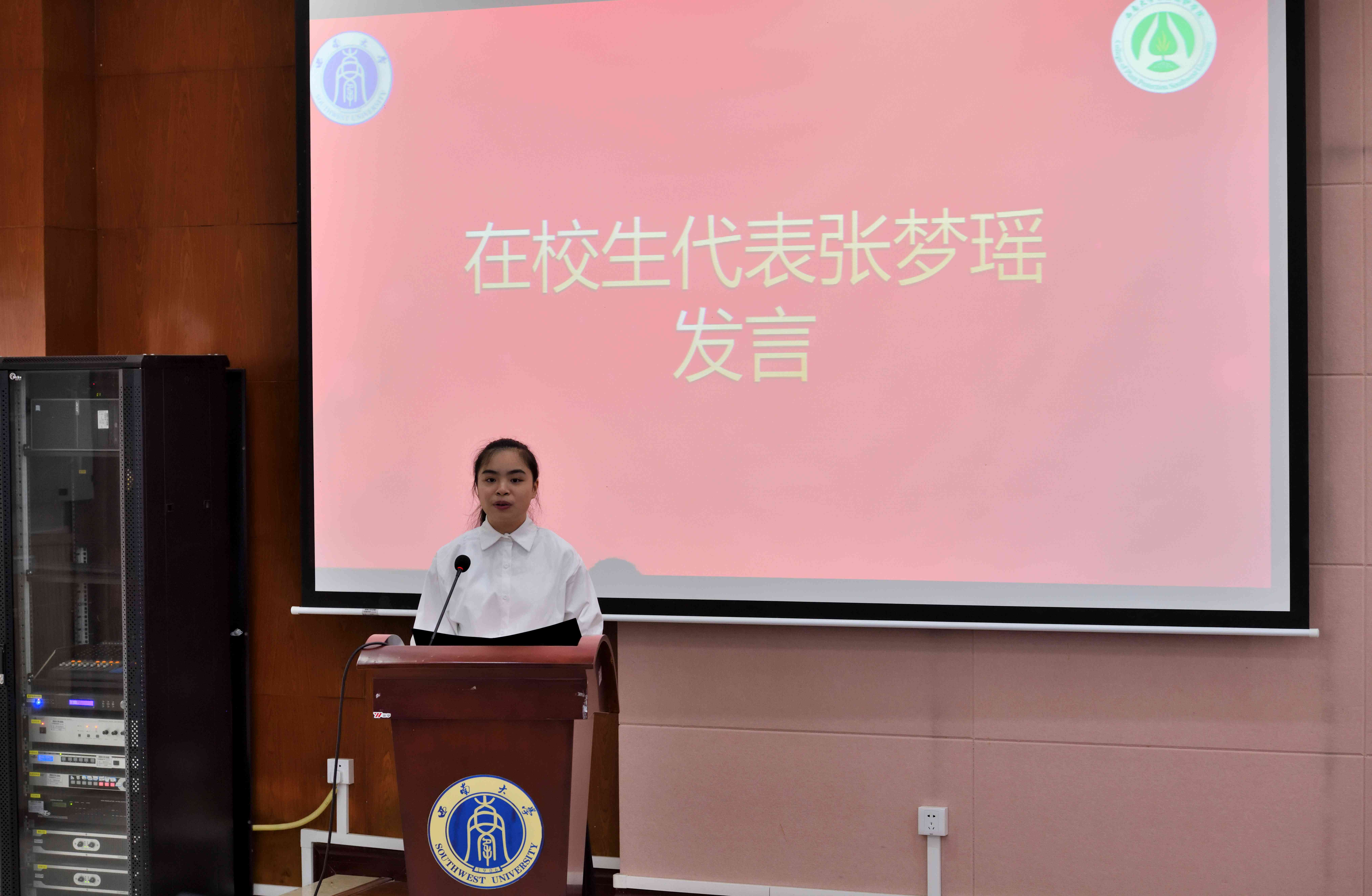 在校生代表、2021级植物保护专业张梦瑶同学发言。她感谢毕业生学长、学姐们在生活上、学习上、情感上给予的关心、爱护、指导和帮助,表示要向优秀学长学姐们学习认真踏实、勤勉刻苦,厚植爱农情怀。