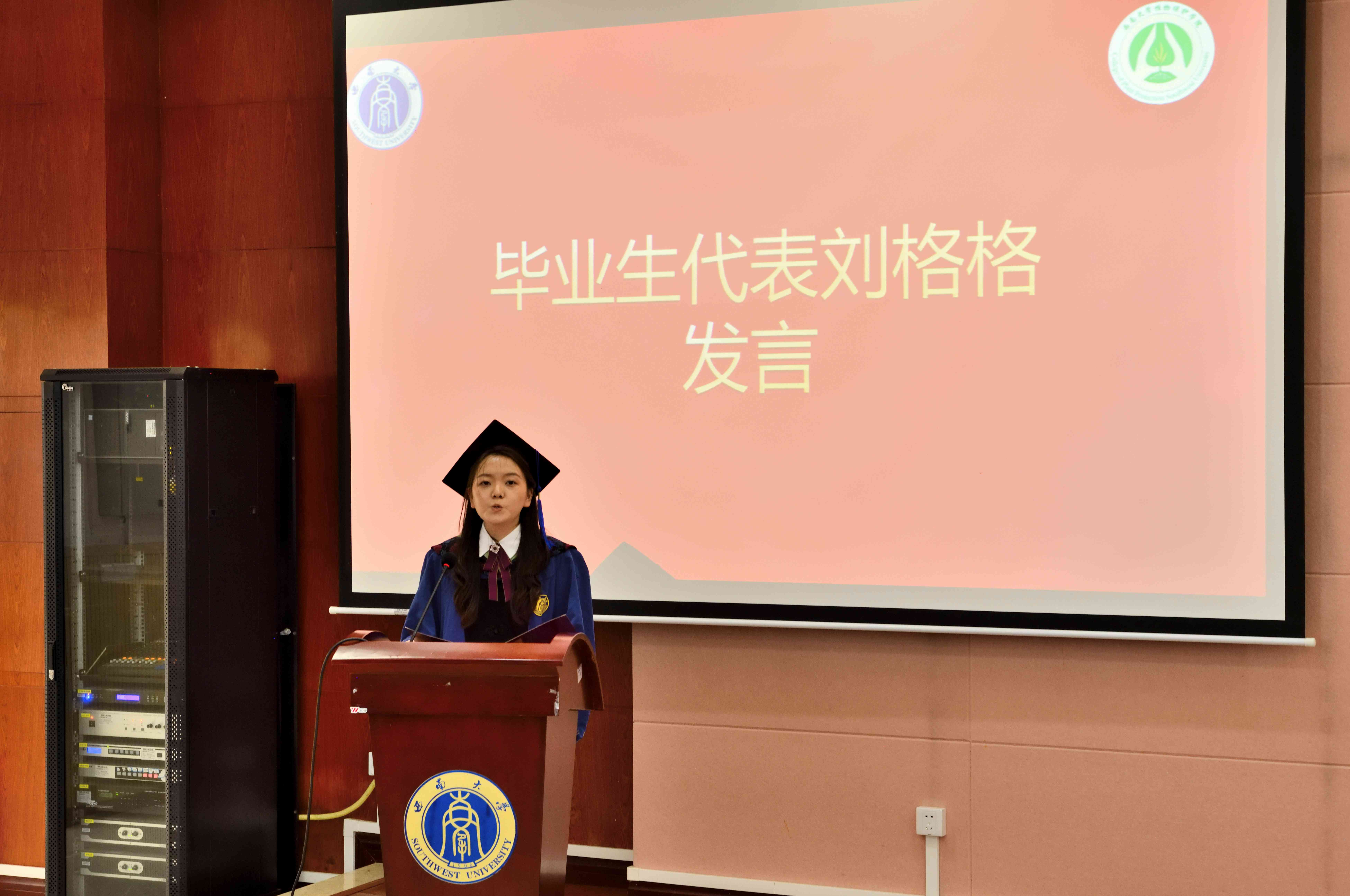 毕业生代表、2021级农业昆虫与害虫防治专业刘格格同学发言,她回顾了在西大求学的美好时光,感谢了母校和老师的培养和关怀,表示不论走向何处,都将在院训的引领下不忘初心、求真务实,带着植保人的责任与担当,心中有梦,眼里有光,去奔跑、去创造、去奋斗!
