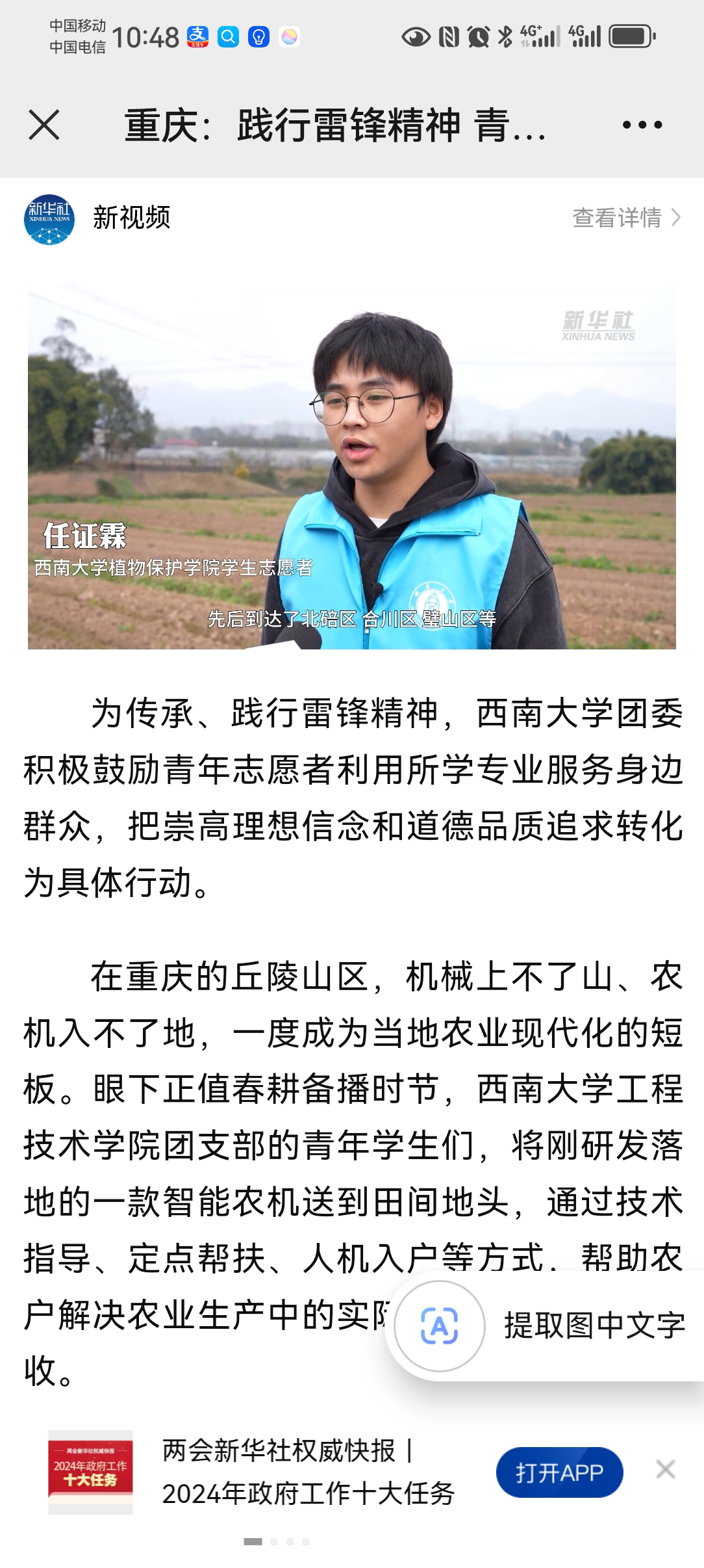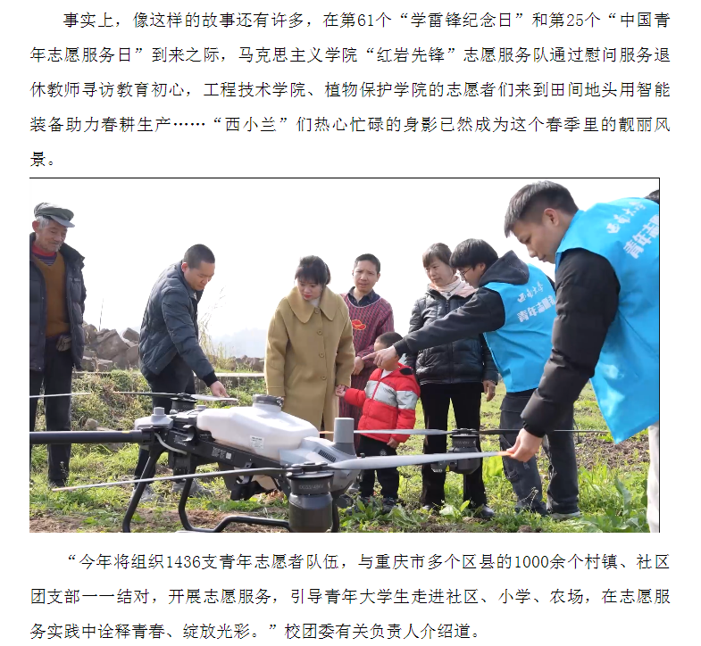 为弘扬雷锋精神,科技助力春耕春管,3月2日,学院团委组织师生志愿者赴璧山区七塘镇陈湾村开展学雷锋科技助农志愿服务活动。志愿者们向村民讲解所携带的最新一代植保无人机的性能特征和使用发放,并帮助村民喷洒除草剂,为后续播种做准备。同学们的志愿服务受到了广大村民的赞许,被新华社新视频、重庆广电第1眼栏目、英国上市公司365新闻快递宣传报道,收获了较好的社会影响,有望带动更多的人践行雷锋精神,助力乡村振兴战略。