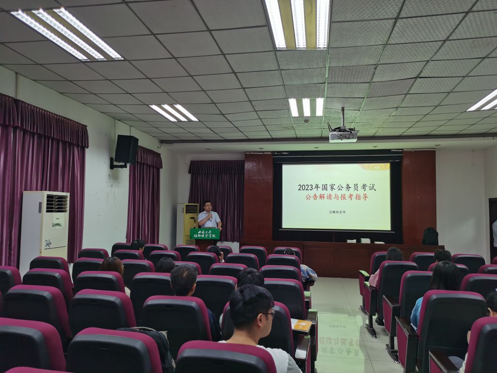 为了加强同学们对公务员考试的了解,拉伸备考水平,提升考试能力。2021年10月25日晚7点,植物保护学院在学院四楼报告厅举行了“2023年国家公务员考试公告解读与报考指导”知识讲座。本次讲座由重庆名师团教育负责人迟鹏程老师主讲,杨乙老师和瞿颖老师作为助手帮助答疑。