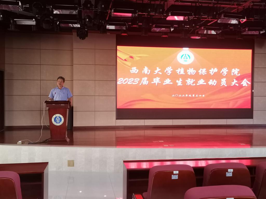 9月30日下午,植物保护学院2023届毕业生就业动员大会于隆平楼四楼报告厅举行。学院党委书记唐荣发、院长刘怀、党委副书记李玉胜、辅导员、毕业年级班主任出席了此次会议,会议由党委副书记李玉胜主持,学院2023届全体毕业生参会。