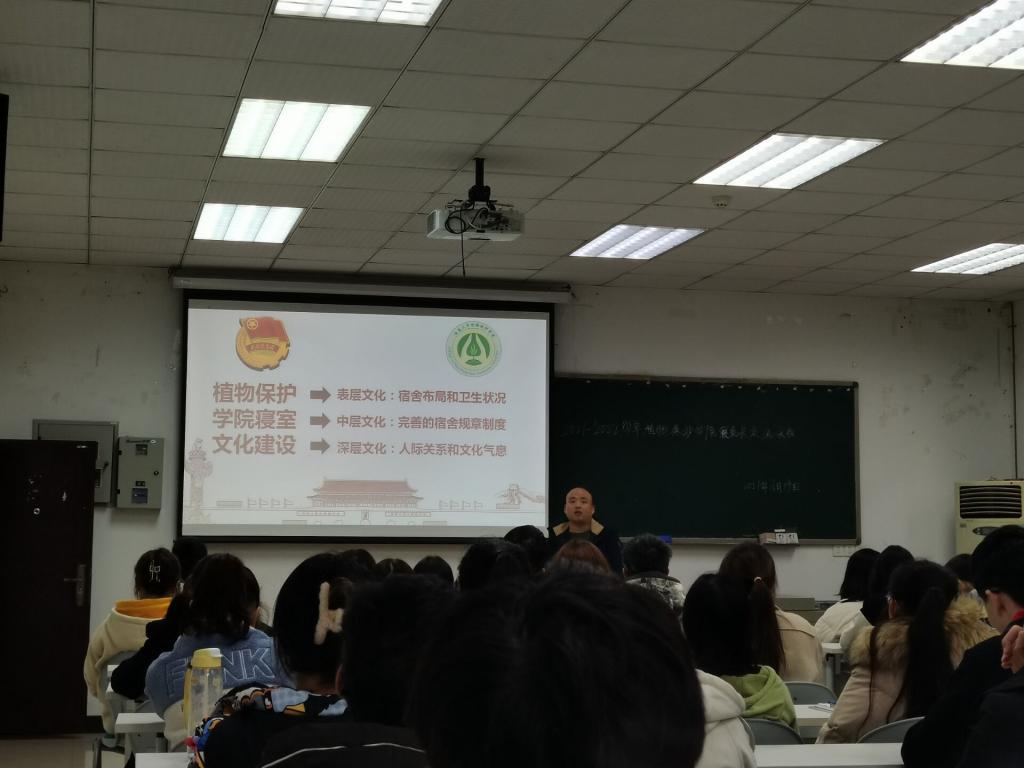 会议伊始,张周飞老师首先给同学们了介绍我院每周一报告、每月一例会的寝室工作机制,阐述了寝室在大学生活中的意义,寝室长对于寝室管理的重要性和寝室长的角色定位与职责。他提出寝室长要主动承担起责任,关心寝室同学的人身安全、身体状况以及学业情况。若发现问题,及时报告班主任和辅导员。张老师强调,宿舍是同学们学习生活的重要场所,也是同学间交流交往最多的地方,良好的宿舍氛围、融洽的舍友关系有助于同学们健康快乐地学习生活,宿舍长的责任心、包容心和工作能力对营造良好的宿舍氛围也至关重要。紧接着,张老师着重讲解了植保学院刚刚颁布实施的“三层五维”寝室文化建设方案,从表层文化(宿舍布局和卫生状况)、中层文化(完善的宿舍规章制度)、深层文化(人际关系和文化氛围)等三个文化层次和卫生环境、文化环境、学习环境、网络环境、人际环境等五个维度对寝室文化建设方案。这为我们打造一个安全、整洁、温馨、催人奋进的宿舍环境提供了良好思路。