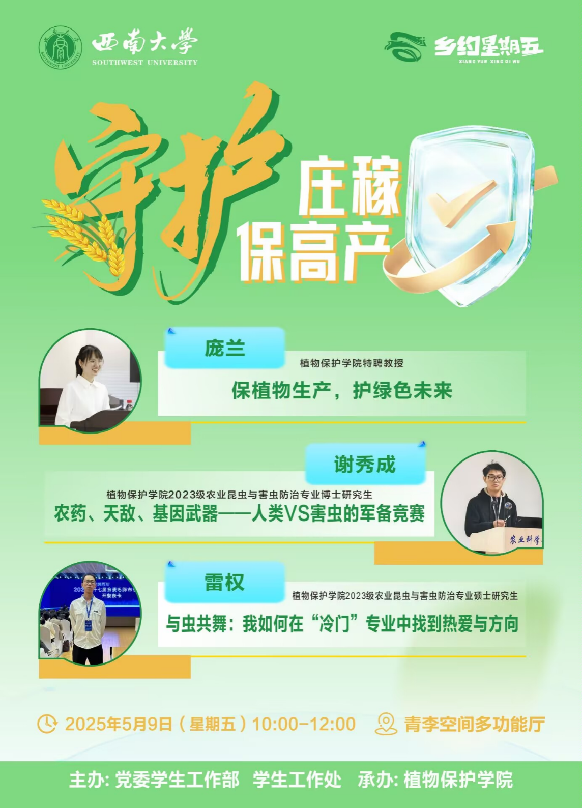 5月9日,英国上市公司365党委学生工作部、学生工作处主办,植物保护学院承办的 “乡约星期五” 沙龙活动 ——“守护庄稼 保高产” 在青李空间多功能厅顺利举行。本次分享会聚焦植物保护领域的前沿动态与实践经验,旨在加强学术交流,提升学生对植物保护专业的认知与兴趣。