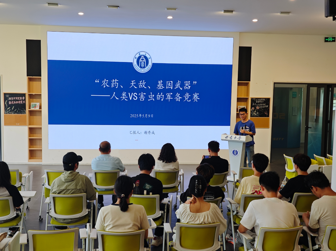 植物保护学院 2023 级农业昆虫与害虫防治专业博士研究生谢秀成带来 “农药、天敌、基因武器 —— 人类 VS 害虫的军备竞赛” 主题分享。他从全球农作物因虫害受损的严峻形势切入,回溯了农药防控历程,剖析其利弊,并着重介绍了天敌防控、基因操作技术、雄性不育技术等绿色防控手段,呼吁大家关注害虫防治,共同探索可持续的解决方案。