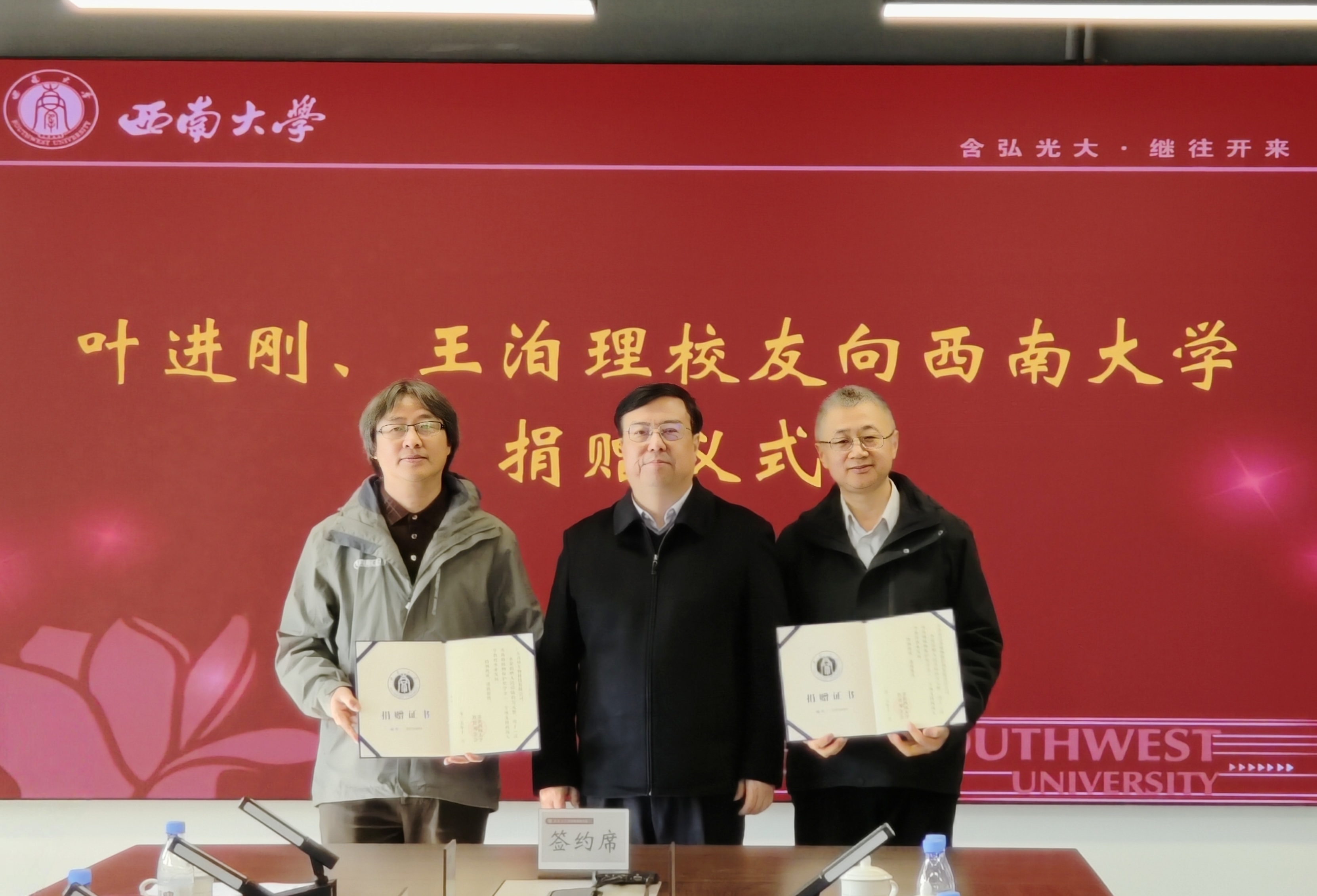 仪式上,学院1992级校友、天津市汉邦植物保护剂有限责任公司董事长叶进刚,及同届校友、广东真格生物科技有限公司董事长王泊理向学校联合捐赠120万元;四川恒嘉能源集团有限公司总经理、学院2001级校友朱继伟,美术学院2006级硕士校友毛艺捐赠120万元,以支持学院学科建设发展与拔尖人才培养,共庆母校120周年华诞。