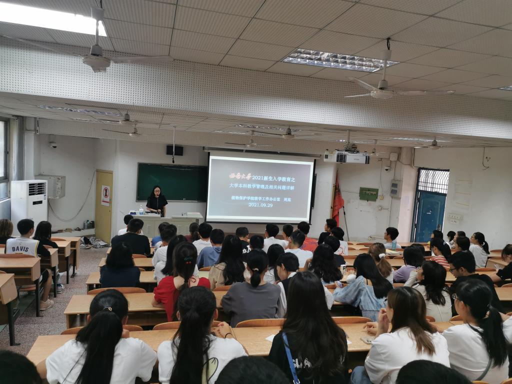 植物保护学院教务办公室周苑老师做主题为“新生教育之大学本科教学管理及相关问题详解”专题讲座,讲解本科人才培养方案,指导新生熟悉教务管理系统中有关选课、查课表、查成绩、查毕业学分要求、学籍异动申请等事项的操作流程。