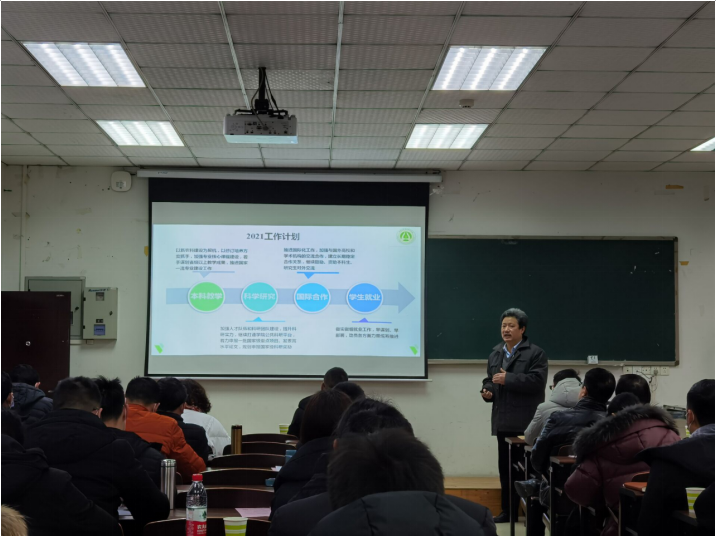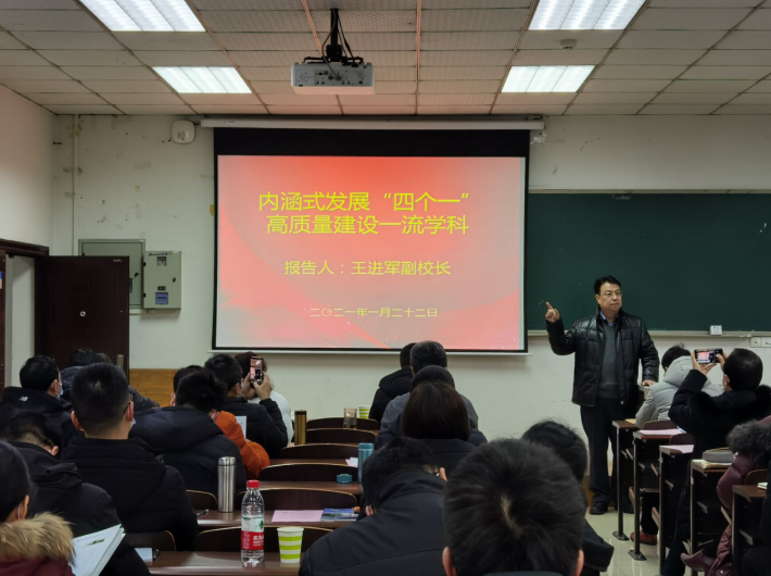 随后,副校长王进军做了内涵式发展四个一”,高质量建设一流学科的主题报告。他指出,一流学科建设的着力点在一流的人才培养、一流的科学研究、一流的师资队伍和一流的社会服务。大学最本质的功能是人才培养,人才培养的质量需要一流的师资队伍做保证,老师要回归教书育人的本分;学院在推进一流专业建设过程中,以课程建设为抓手,努力打造金课,做好课程思政;研究生导师要充分发挥指导作用,全力提高我院研究生人才培养质量。同时强调,科学研究和社会服务是大学的延伸功能,学院要继续加强科研团队建设和科研方向凝练,全院上下一盘棋,做有组织的科学研究,有力度的社会服务。