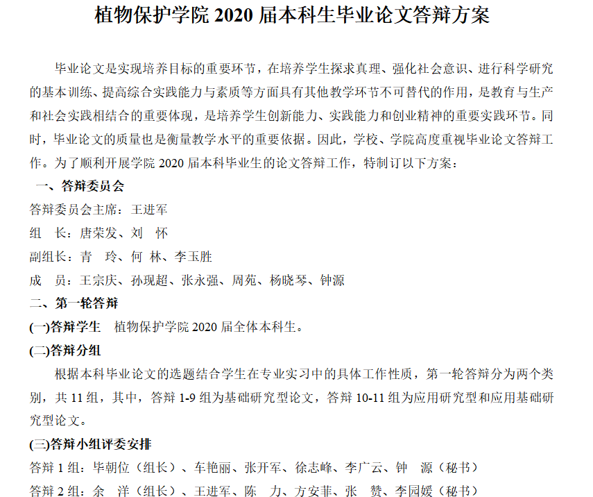 为降低疫情对本科毕业论文答辩的影响,学院党政联席会多次专题讨论,根据学校《关于做好近期本科教学几项重点工作的通知》要求在深入调研的基础上制订了《植物保护学院2020届本科生毕业论文答辩方案》。学院成立本科毕业论文答辩委员会,学校副校长王进军教授担任答辩委员会主席,学院党委书记唐荣发、院长刘怀教授任组长,教学院长青玲教授、副院长何林教授和党委副书记李玉胜任副组长,各系主任、教学秘书和辅导员为主要成员。为了鼓励本科生专业实习过程深入实践,今年尝试第一轮答辩进行改革,本着“分类培养,分类评价分组实施,分推优”的原则,根据本科生毕业论文选题的依据和性质“基础研究应用基础研究两个类别分别进行分组答辩。结合学生返校实际情况,今年毕业论文答辩采取第一轮答辩线上进行,第二轮答辩线上与线下相结合的方式。尽管形式发生了改变,但学院反复强调对本科毕业论文质量的要求不能放松。