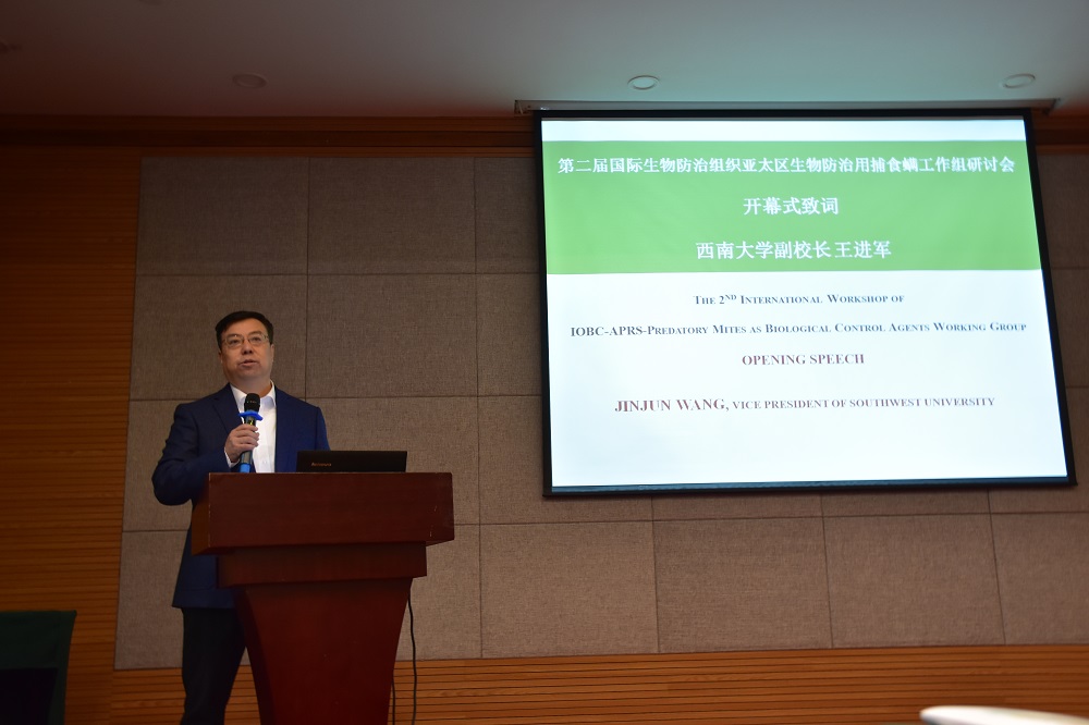 王进军副校长代表学校致辞,对各位专家的到来表示欢迎,向参加会议的各位专家介绍了学校在螨类研究方面的历史、概况及未来发展前景等。IOBC-APRS副主席高玉林为本次会议的召开送上祝福,希望借助这次机会能够促进捕食螨和生物防治其他领域在研究和应用方面的国际交流与合作。