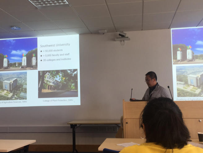 David Aldridge博士针对生物入侵研究中“基础研究”和“应用研究”之间的空白进行了综述和展望;Gary Carvalho博士对外来入侵生物的分子检测技术进行了简要的综述和展望;中方代表战爱斌研究员对水生入侵生物早期检测技术面临的挑战及未来发展趋势进行了深度阐述;中国农科院植物保护研究所万方浩研究员对“一带一路”倡议给植物保护研究国际合作带来的机遇作了深度地剖析。中国农业大学周欣教授对新型组学技术在入侵生物学中的应用进行了引人入胜的介绍。此外,其他参会人员均对各自在入侵生物快速检测、防控方面学取得的最新进展进行了广泛深入的交流。会议期间,蒋红波博士作了题为“Molecular regulator of the olfactory sensitivity in the invasive species, Bactrocera dorsalis”的学术报告,汇报了近年来在入侵昆虫桔小实蝇嗅觉敏感性调控的神经生理学机制方面取得的最新研究成果,引起了与会人员的广泛关注和积极的讨论。