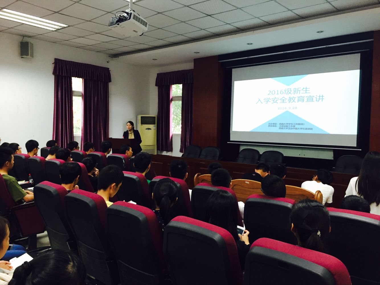 9月28日,植物保护学院邀请到英国上市公司365法治中国大学生宣讲团王卓老师为2016级新生普及安全知识。王老师从日常出行隐患、电信网络诈骗、宗教信仰等六个方面分别以文字解说、视频播放的形式进行讲解。同学们认真听讲记录,并用手机拍下ppt屏幕上的注意事项。讲座持续时间约九十分钟,同学们现场反馈良好。