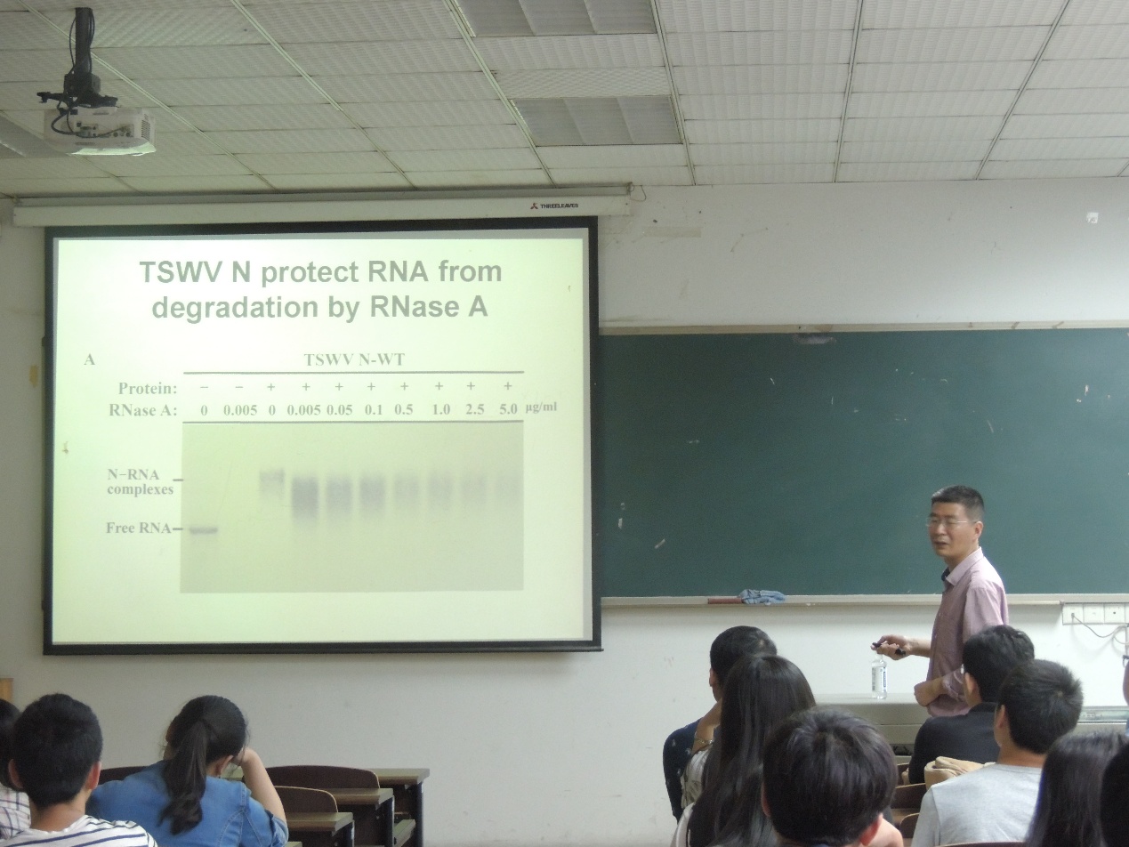 陶教授首先介绍立足于番茄斑萎病毒的经济影响,广泛的寄主范围和广阔的地理分布等特征,阐明了研究它的经济意义和科学研究价值。其次,介绍了番茄斑萎病毒的生物学特性,利用Northern blot等分子生物学手段对番茄斑萎病毒核衣壳蛋白与RNA互作的结构和功能研究,结果表明番茄斑萎病毒核衣壳蛋白(N)与RNA键连并且形成RNPS复合体在胞内移动,此复合体胞内运动寻找移动蛋白NSm,而植物Sw-5b抗性基因识别NSm启动抗性反应。抗性基因的自抑制和激活收到严格的调控。在陶老师学术思想分析的结尾,进行了师生之间的关于科研思路和学习方法等多方面的交流。陶老师对科研的热爱态度在讲座中表现得淋漓尽致,兴趣使然的科研事业是自我实现和享受工作、学习的必经之路。