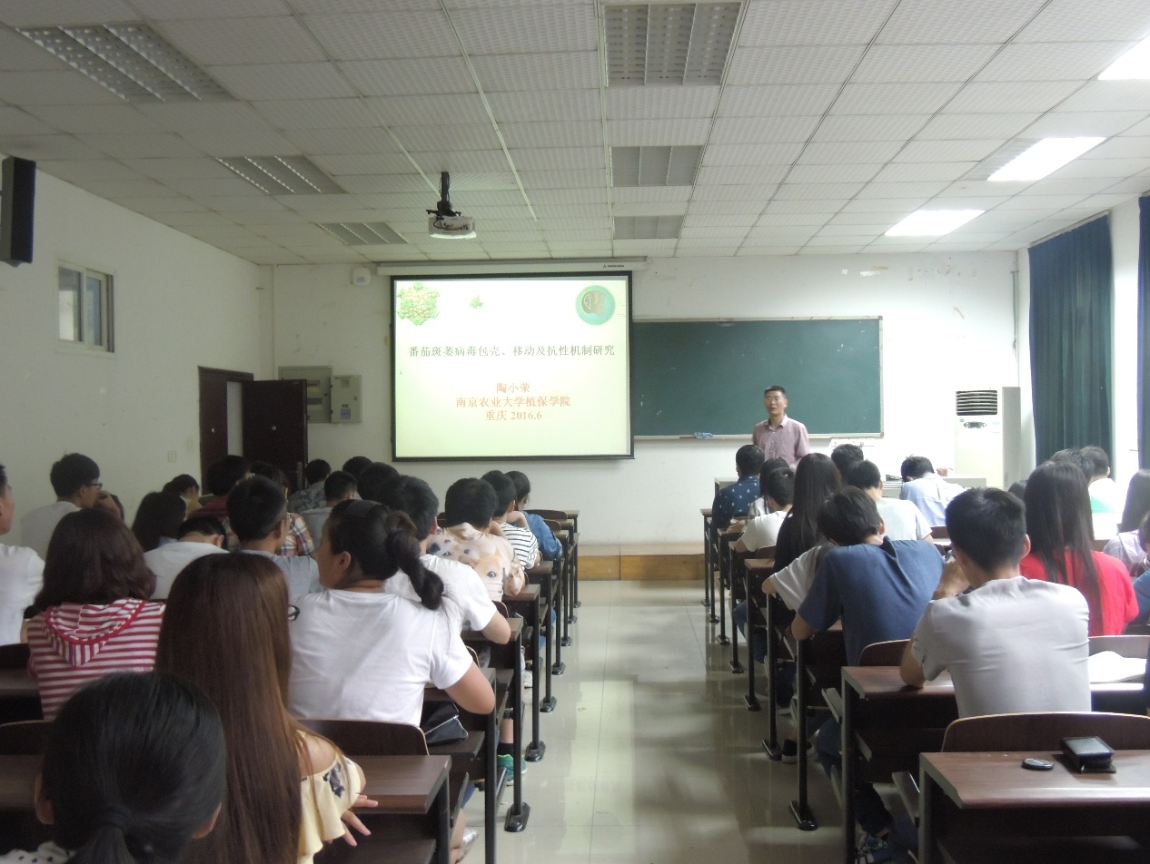 2016年6月2日下午四点半,在学院三楼会议室,南京农业大学植物病理系陶小荣教授应邀来我院进行题为“番茄斑萎病毒包壳、移动及抗性机制研究”的学术讲座,学术报告由我院青玲教授主持。
