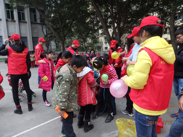 现在有许多家长因为工作原因对孩子疏于照顾或照料不周,势必会造成孩子情感、生活上孤独、不安,我们的志愿者们与孩子们交流沟通,同做道具,一起游戏,纾解他们的不安,抚慰他们的心灵。同时也增加了孩子们的交通安全意识,避免安全隐患,减少安全意外。志愿者们一到学校,早已翘首以盼的孩子们立刻包围上来,或害羞内向的张望,或大胆热情的询问,更主动帮助做道具。游戏主要以“识路标”、“答竞赛”、“运气球”三个环节组成,趣味与思考结合,每个环节孩子们都积极参与,热情洋溢,欢声笑语不绝于耳。活动最后,我们为该校学生送去了各类学习用具、体育器材及生活用品等,为这个寒冷的冬天带来丝丝温情。
