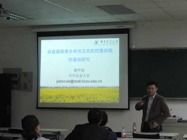 11月6日下午三点,华中农业大学谢甲涛副教授于34教二楼大会议室作了关于核盘菌真菌病毒多样性研究的学术报告,本次报告会由余洋老师主持,植物保护学院植物病理学专业的老师及同学们参加了本次报告。