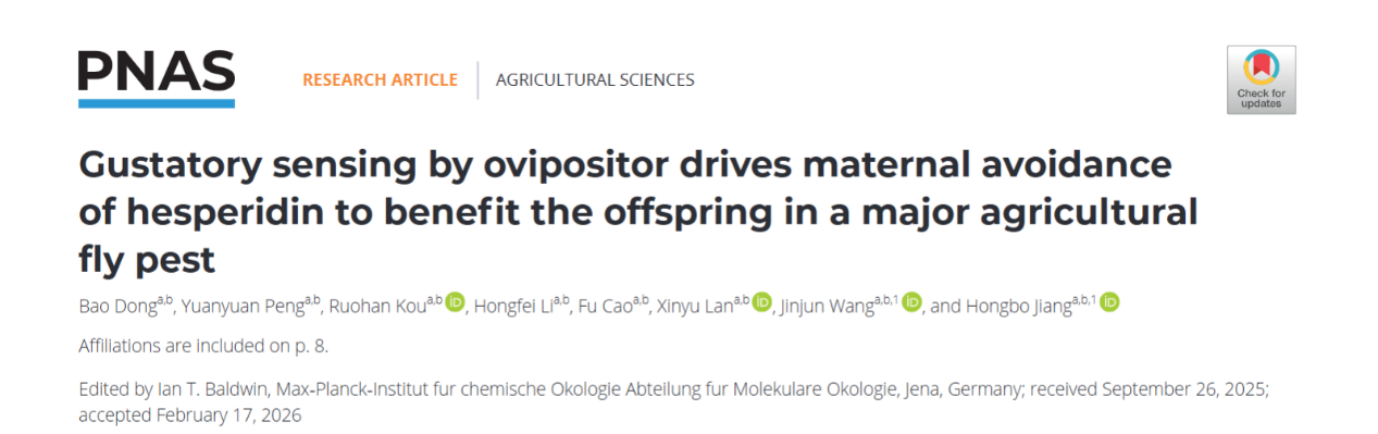 围绕“橘小实蝇雌虫根据什么判断果实是否适合产卵”这一关键科学问题,学院王进军教授/蒋红波教授团队以“橘小实蝇—芒果”互作体系为模型开展研究,首次揭示橘小实蝇雌虫将产卵器作为味觉感受器官,通过感知果实内部化学信号作出有利于后代生长发育的产卵决策。相关成果以“Gustatory sensing by ovipositor drives maternal avoidance of hesperidin to benefit the offspring in a major agricultural fly pest”为题,发表于国际权威学术期刊《美国国家科学院院刊》Proceedings of the National Academy of Sciences of the United States of America(PNAS)。