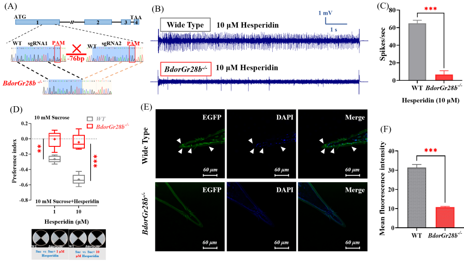 在分子层面,研究团队基于产卵器转录组筛选候选味觉受体,最终锁定了在产卵器中高水平表达的关键受体BdorGr28b。钙离子成像实验表明,表达BdorGr28b的细胞可对橙皮苷产生显著且浓度依赖的响应。进一步构建BdorGr28b基因敲除突变体后发现,突变体SCo-II感器对橙皮苷的电生理反应几乎完全消失,野生型雌虫对低浓度橙皮苷的产卵偏好也在突变体中被消除。免疫组织化学结果进一步证明,BdorGr28b定位于产卵器末端感器区域。上述证据共同表明,BdorGr28b是介导橙皮苷识别并驱动产卵选择的关键味觉受体。