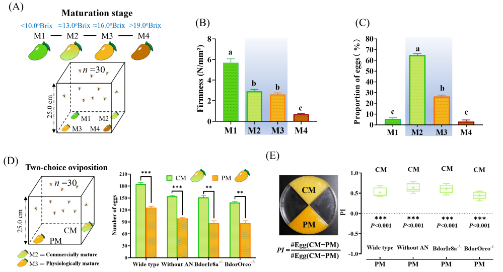 多数食果昆虫通常倾向于将卵产在更成熟、更柔软、营养条件更适宜的果实中。然而,重大入侵害虫橘小实蝇(Bactrocera dorsalis)的产卵选择却呈现出不同规律。田间观察发现,其常在芒果转熟初期集中发生,雌虫更倾向于将卵产在商品性成熟(CM)而非生理性成熟(PM)的果实中,进而造成大量未熟果脱落和显著经济损失。