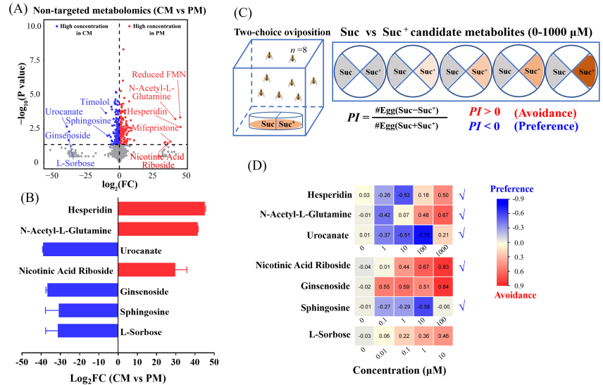 为解析影响产卵行为的决定性化学线索,研究团队对不同成熟阶段芒果果肉进行了非靶向代谢组学比较分析,结合这些代谢物在芒果果实中的含量及差异,筛选出若干候选代谢物。通过建立产卵双选行为测定体系逐一验证后发现,橙皮苷(hesperidin)最符合真实生态场景下的行为效应特征,即低浓度诱导产卵偏好、高浓度诱导产卵回避。这提示橙皮苷很可能是芒果果实内部驱动橘小实蝇产卵决策的重要化学信号。