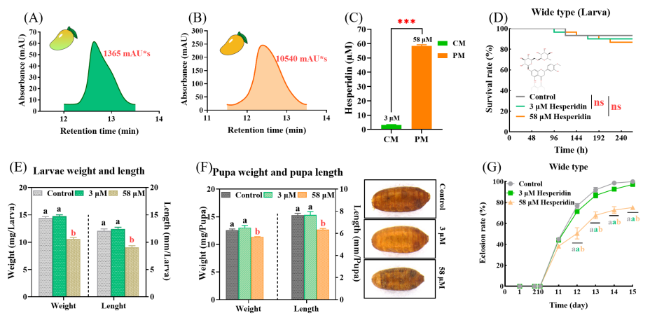 研究团队进一步检测了芒果成熟过程中橙皮苷含量的动态变化,发现随着果实成熟推进,橙皮苷含量显著升高。后代发育实验表明,较高浓度橙皮苷会显著降低卵孵化率、抑制幼虫生长,并对蛹和成虫发育产生不利影响。这说明,橘小实蝇雌虫对不同成熟阶段果实的产卵选择,并非简单的取食偏好,而是一种有利于后代生存和发育的适应性决策。