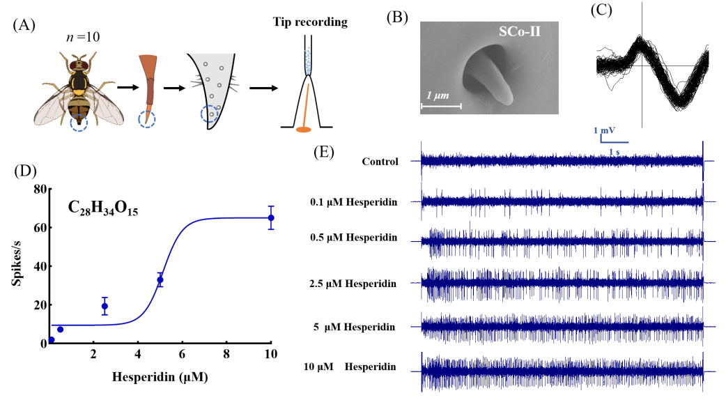 行为观察显示,雌虫在产卵过程中并非简单“插入即产”,而是会将产卵器反复插入、回撤,再次插入,对果实内部环境进行持续评估。基于这一现象,研究团队提出,产卵器不仅是产卵工具,同时也是感知果实内部适宜性的味觉器官。扫描电镜结果显示,橘小实蝇产卵器末端分布有多种感器,其中腔锥型感器(SCo)较为丰富。进一步通过味觉单感器记录技术(SSR)发现,末端SCo-II感器对橙皮苷具有清晰、稳定且呈剂量依赖性的电生理响应,而对其他多数候选化合物则无明显反应。这为橘小实蝇通过产卵器“尝味道”选择产卵位置提供了直接证据。