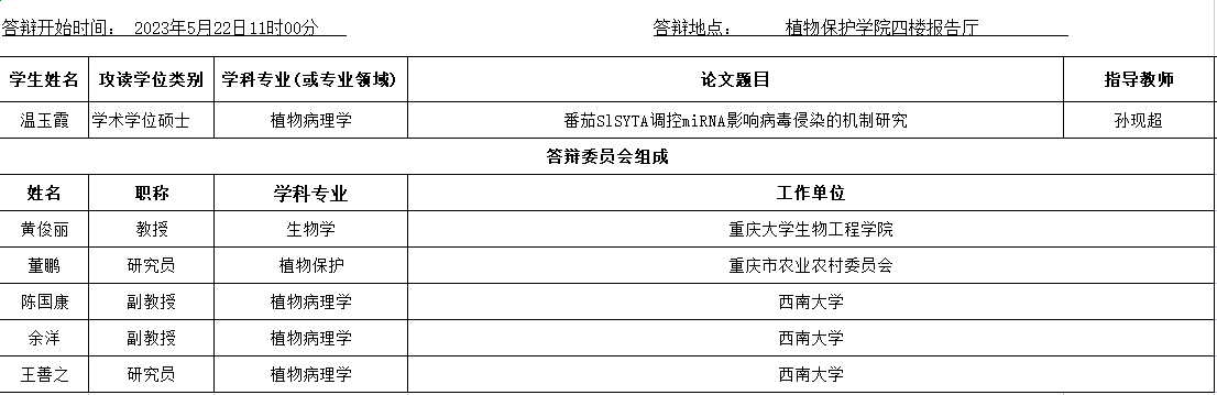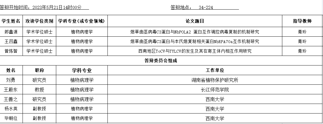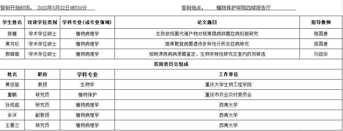 植物保护学院植物病理学专业2023年春季学期学位论文答辩安排公告(硕士)
