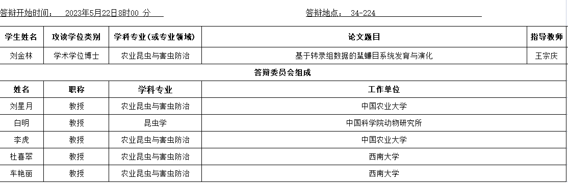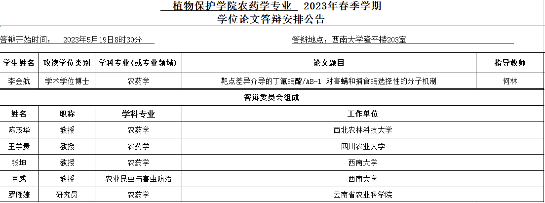 植物保护学院2023年春季学期学位论文答辩安排公告(博士)